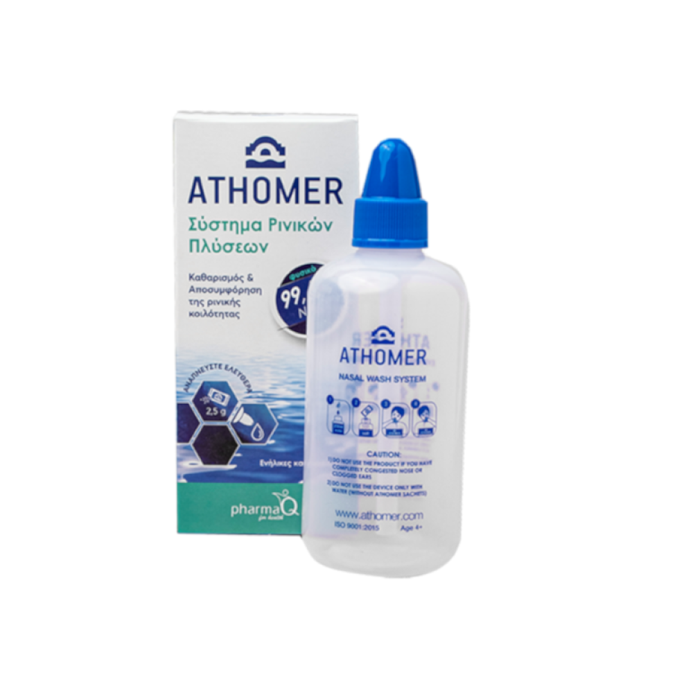 Διαλύετε ένα ή δύο φακελάκια Athomer σε 250ml νερό μέσα στη συσκευή. Σωστή εφαρμογή γίνεται με την έκχυση αλατούχου νερού από το ένα ρουθούνι και την εκροή του από το άλλο.