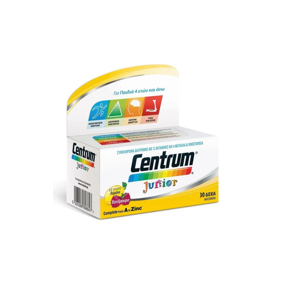 Το Centrum Junior, με ειδικά διαμορφωμένη σύνθεση βιταμινών και μετάλλων, συμπληρώνει την καθημερινή διατροφή των παιδιών. Κατάλληλο για παιδιά 4 ετών και άνω. Σε μασώμενα δισκία. Με ευχάριστη γεύση βατόμουρο-λεμόνι.
