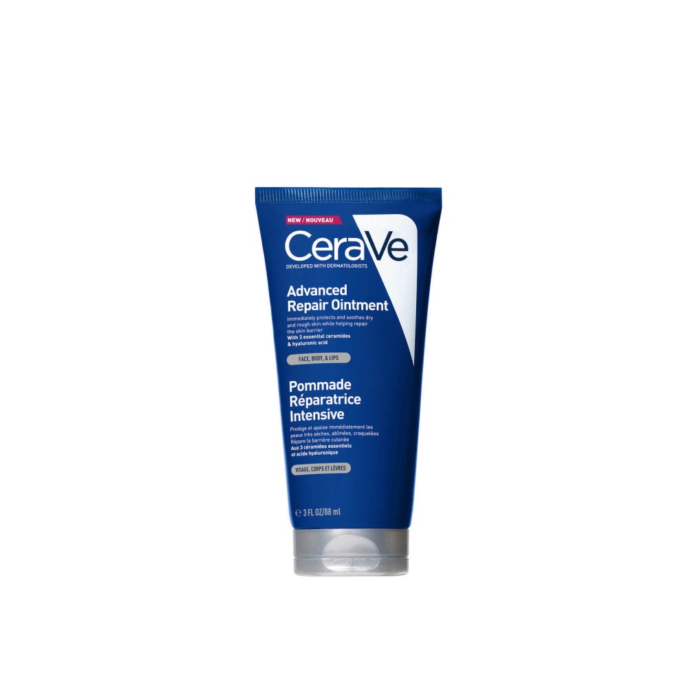 Το CeraVe Advanced Repair Ointment είναι μία επανορθωτική αλοιφή για πρόσωπο, σώμα και χείλη. Προστατεύει και ανακουφίζει άμεσα το πολύ ξηρό και τραχύ δέρμα. Βοηθάει στην αποκατάσταση του επιδερμιδικού φραγμού. Με 3 απαραίτητα ceramides & υαλουρονικό οξύ.