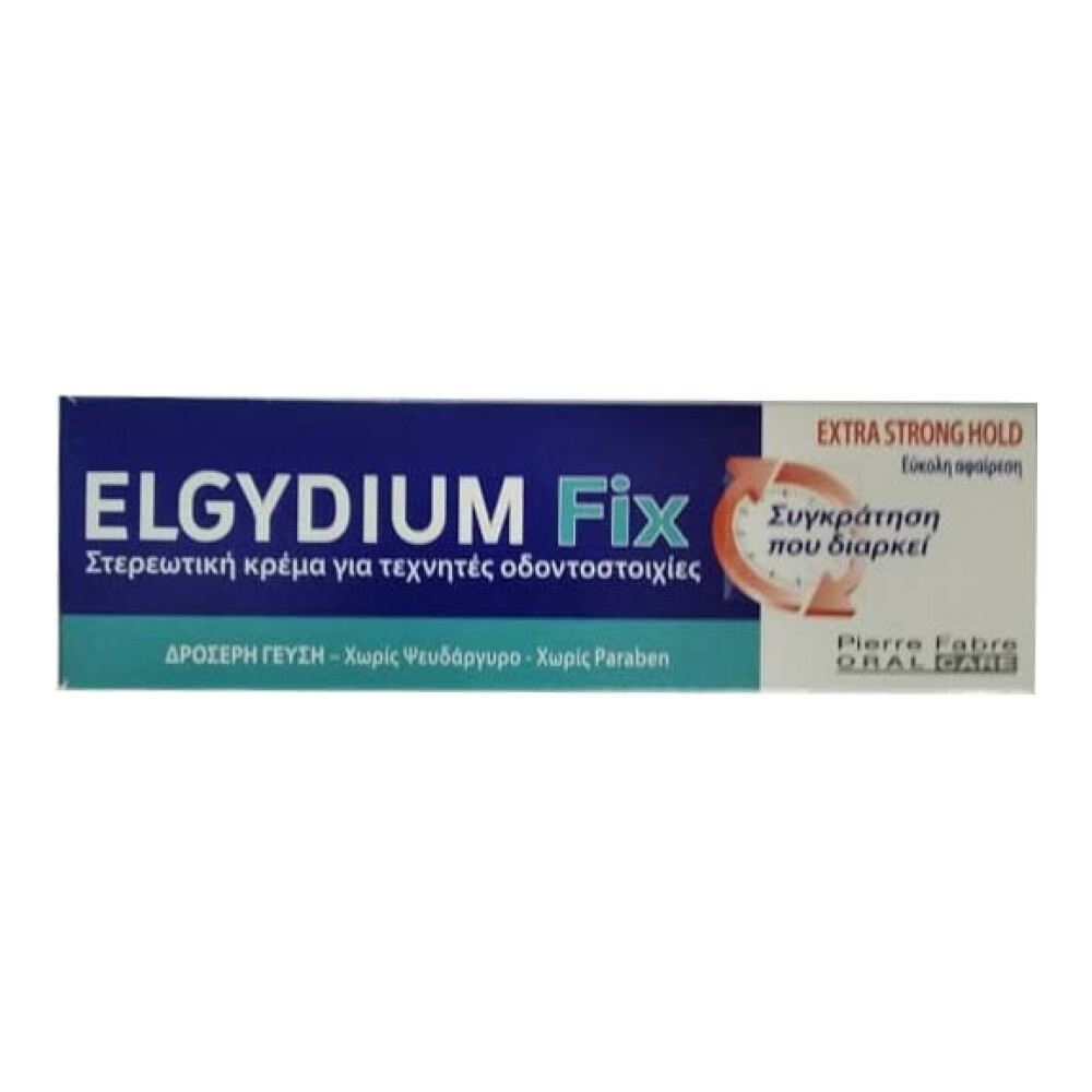Η στερεωτική κρέμα ELGYDIUM FIX EXTRA STRONG HOLD εγγυάται τη γρήγορη και μεγάλης διάρκειας προσκόλληση της οδοντοστοιχίας.