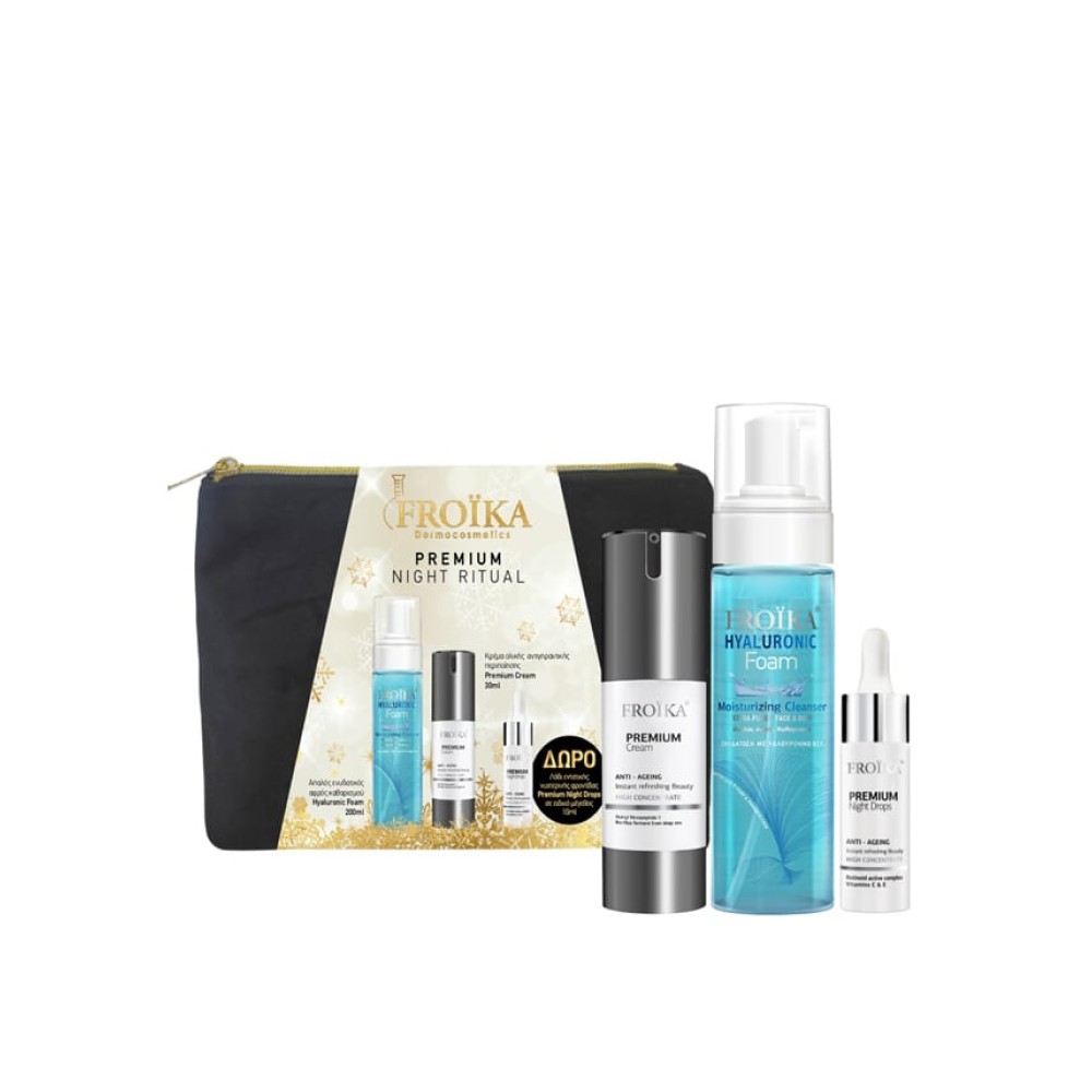 Το σετ περιποίησης Premium Night Ritual περιλαμβάνει κρέμα προσώπου Premium Cream 30 ml και αφρό καθαρισμού Hyaluronic Foam 200 ml για ολοκληρωμένη φροντίδα της ώριμης επιδερμίδας & λάδι νυχτερινής φροντίδας σε ειδικό μέγεθος 10 ml & υπέροχο νεσεσέρ.