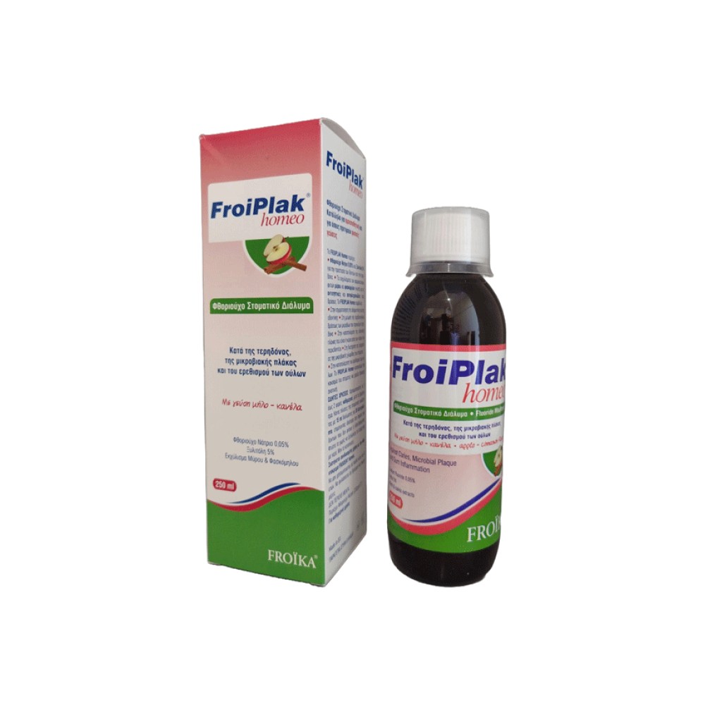 Φθοριούχο στοματικό διάλυμα κατάλληλο για ομοιοπαθητική και για όσους προτιμούν φυσικές γεύσεις. Για καθημερινή χρήση.Το Froiplak Homeo συμβάλλει στην ισχυροποίηση της αδαμαντίνης και της οδοντίνης, στη μείωση της τερηδονογόνου δράσεως των μικροβίων που προκαλούν τερηδόνα.Ακόμα βοηθά στην καταπολέμηση της οδοντικής πλάκας που είναι η κύρια αιτία των νόσων του περιοδοντίου, στη διατήρηση της ισορροπίας της μικροβιακής χλωρίδας του στόματος και τέλος, στην καταπολέμηση του ερεθισμού των ούλων.Κατάλληλο για ομοιοπαθητική και για όσους προτιμούν φυσικές γεύσεις.