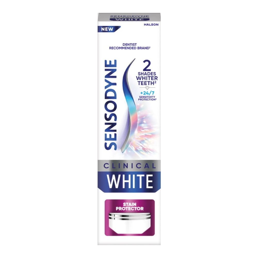 Επωφεληθείτε από δύο οφέλη σε ένα κάθε φορά που βουρτσίζετε. Η οδοντόκρεμα Sensodyne Clinical White Stain Protector προσφέρει κλινικά αποδεδειγμένη λεύκανση, ειδικά σχεδιασμένη για ευαίσθητα δόντια. Βοηθά στη λεύκανση των δοντιών έως και δύο τόνους*, παρέχοντας παράλληλα προστασία από την ευαισθησία 24/7^ σε μια σύνθεση ασφαλή για το σμάλτο, αρκετά απαλή για καθημερινή χρήση. Η σύνθεση τριπλής δράσης περιέχει κλινικά ελεγμένα συστατικά λεύκανσης που λευκαίνουν, γυαλίζουν και βοηθούν στην προστασία από μελλοντικούς λεκέδες. Απολαύστε ένα πιο λευκό, λαμπερό χαμόγελο* με την αξιόπιστη προστασία ευαισθησίας της Sensodyne, της #1 μάρκας που συνιστούν οι οδοντίατροι για ευαίσθητα δόντια.