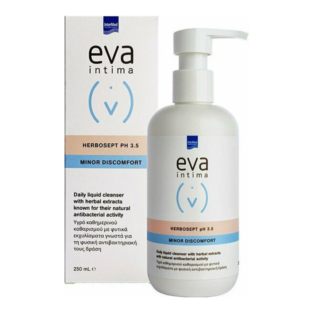 Το Intermed Eva Intima Wash Herbosept είναι ειδικά σχεδιασμένο απαλό υγρό καθημερινού καθαρισμού χωρίς σαπούνι, συμβατό με τη φυσιολογία της ευαίσθητης περιοχής γυναικών κάθε ηλικίας. Καθαρίζει απαλά απομακρύνοντας εκκρίσεις και οσμές χωρίς να ξηραίνει ή να ερεθίζει το δέρμα, αφήνοντας άμεσα αίσθηση φρεσκάδας και καθαριότητας. Η επιλογή του είναι ιδανική σε περιπτώσεις που υπάρχει ανάγκη έντονης προστασίας από βακτήρια τα οποία μπορεί να οδηγήσουν στην εμφάνιση λοιμώξεων (αιδοιοκολπίτιδα) όπως π.χ. κατά τη περίοδο της εγκυμοσύνης και μετά τον τοκετό. Η χρήση του Eva Intima Wash Herbosept παράλληλα με την αγωγή για την αντιμετώπιση κολπικών λοιμώξεων βακτηριακής αιτιολογίας, συντελεί στην επιτυχή θεραπεία και πρόληψη αυτής