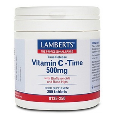 Vitamin C Time Release 500mg με προσθήκη βιοφλαβονοειδών & καρπούς αγριοτριανταφυλλιάς Η Βιταμίνη C είναι απαραίτητη για ένα υγειές ανοσοποιητικό σύστημα, υγιή οστά, δόντια και ούλα καθώς επίσης και στην διατήρηση σε κανονικά επίπεδα της χοληστερόλης του αίματος . Οι ανάγκες του οργανισμού σε Βιταμίνη C είναι μεγαλύτερες από οποιαδήποτε άλλη υδατοδιαλυτή βιταμίνη. Ο ιδανικός τρόπος πρόσληψης της Βιταμίνης C είναι σε μικρές ποσότητες συνεχόμενα κατά τη διάρκεια όλου του εικοσιτετραώρου, καθώς λόγω. Κάτι τέτοιο όμως είναι πολύ δύσκολο. Για την επίλυση του προβλήματος αυτού η Lamberts δημιούργησε τις ταμπλέτες Βιταμίνης C Time Release . Οι ταμπλέτες παράγονται μετά από μία ειδική διαδικασία, η οποία διατηρεί τα θρεπτικά στοιχεία σε μικροσφαιρίδια, επιτρέποντάς την σταδιακή απελευθέρωση τους κατόπιν της κατάποσης. Με τον τρόπο αυτό επιτυγχάνεται η σταδιακή και συνεχόμενη απορρόφηση της Βιταμίνης C η οποία διαρκεί για περίπου 6 με 8 ώρες. Εκτός αυτού η Βιταμίνη C βαθμιαίας απελευθέρωσης της Lamberts, περιέχει και μία σημαντική ποσότητα βιοφλαβονοειδών τα οποία συμβάλλουν στην απορρόφησή της από τον οργανισμό. Έχει αποδειχθεί ότι τα βιοφλαβονοειδή διαθέτουν συγκεκριμένες βιολογικές ιδιότητες, μία εκ των οποίων είναι η ενίσχυση του τοιχώματος των τριχοειδών αγγείων. Τα βιοφλαβονοειδή που περιέχονται στο συγκεκριμένο σκεύασμα περιλαμβάνουν rutin, quercetin, citrin και hesperidin .