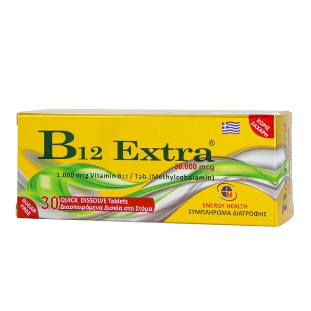 Η βιταμίνη Bio Β12 Extra της Energy Health δεν περιέχει ζάχαρηΠεριεκτικότητα ανά δισκίο Vitamin Bio B12 Extra της Energy Health: 1000mcg Vit B12