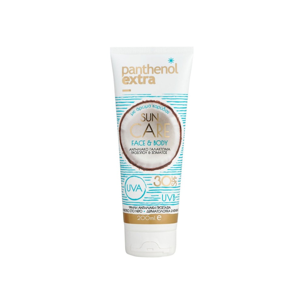 Το Panthenol Extra Sun Care Face & Body SPF30 είναι ένα αντηλιακό γαλάκτωμα προσώπου και σώματος με άρωμα καρύδας, που προστατεύει από την ηλιακή ακτινοβολία και παρέχει εξειδικευμένη φροντίδα στην επιδερμίδα.