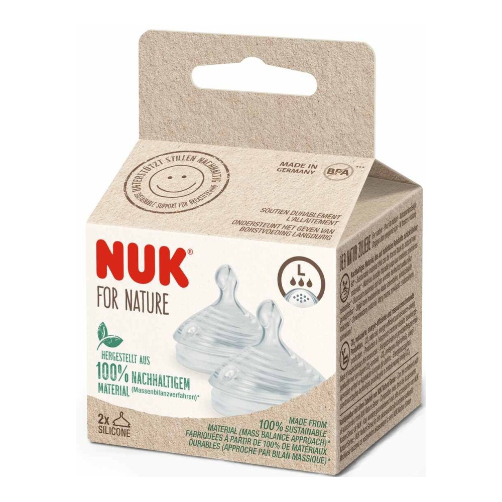 Μέγεθος L με 9 οπές (για γρήγορη ταχύτητα ροής), δεν περιέχει δισφαινόλη Α, συμβατή με όλα τα μπιμπερό της σειράς NUK for Nature και με όλα τα εξαρτήματα της σειράς