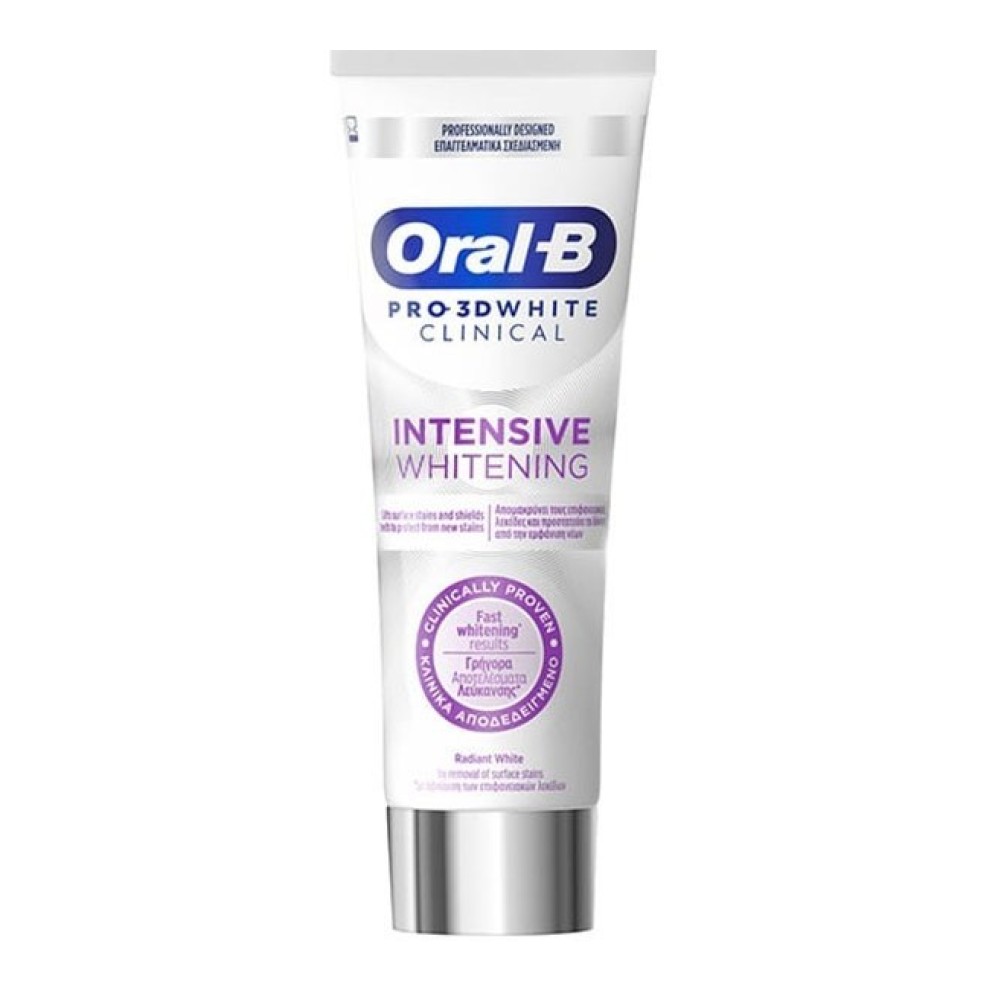 Η οδοντόκρεμα λεύκανσης Oral-B Pro 3D White Clinical Intensive Whitening είναι κλινικά αποδεδειγμένη για πιο λευκά δόντια σε 1 ημέρα, με την αφαίρεση των επιφανειακών λεκέδων.