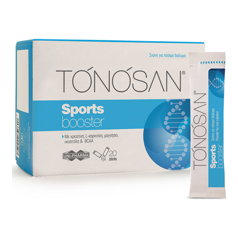 Το συμπλήρωμα διατροφής TONOSAN Sports booster είναι ένα ειδικά σχεδιασμένο συμπλήρωμα διατροφής για την κάλυψη των ιδιαίτερων απαιτήσεων ατόμων που προπονούνται εντατικά ή για μεγάλες χρονικές περιόδους καθώς και για εκείνους που καταπονούν συστηματικά το σώμα τους εξαιτίας π.χ. επαγγελματικής απασχόλησης. Ειδική σύνθεση με κρεατίνη, L-καρνιτίνη, ινοσιτόλη, απαραίτητα αμινοξέα διακλαδιζόμενης αλύσσου (BCAA), ηλεκτρολύτες, βιταμίνες Β & C, μαγνήσιο και κάλιο. Συμβάλλει στην καλή λειτουργία των μεταβολικών διεργασιών για την παραγωγή ενέργειας, στη μείωση της κούρασης, στην καλή λειτουργία των μυών, του νευρικού συστήματος και στη βελτίωση της αντοχής.